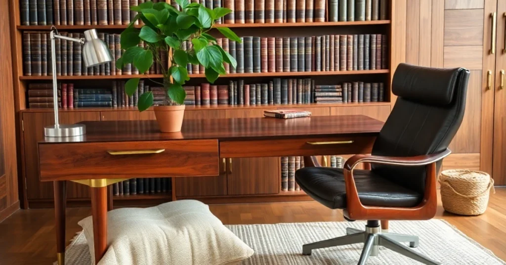 In a recent project, I helped a client transform a cramped guest room into a stunning Mid Century Modern home office. We chose a walnut desk with tapered legs, paired with an Eames Task Chair in tan leather. A mustard throw blanket and a geometric rug added warmth, while floating shelves kept the space tidy. The client reported a 30% increase in daily productivity, thanks to the clutter-free, inspiring environment.